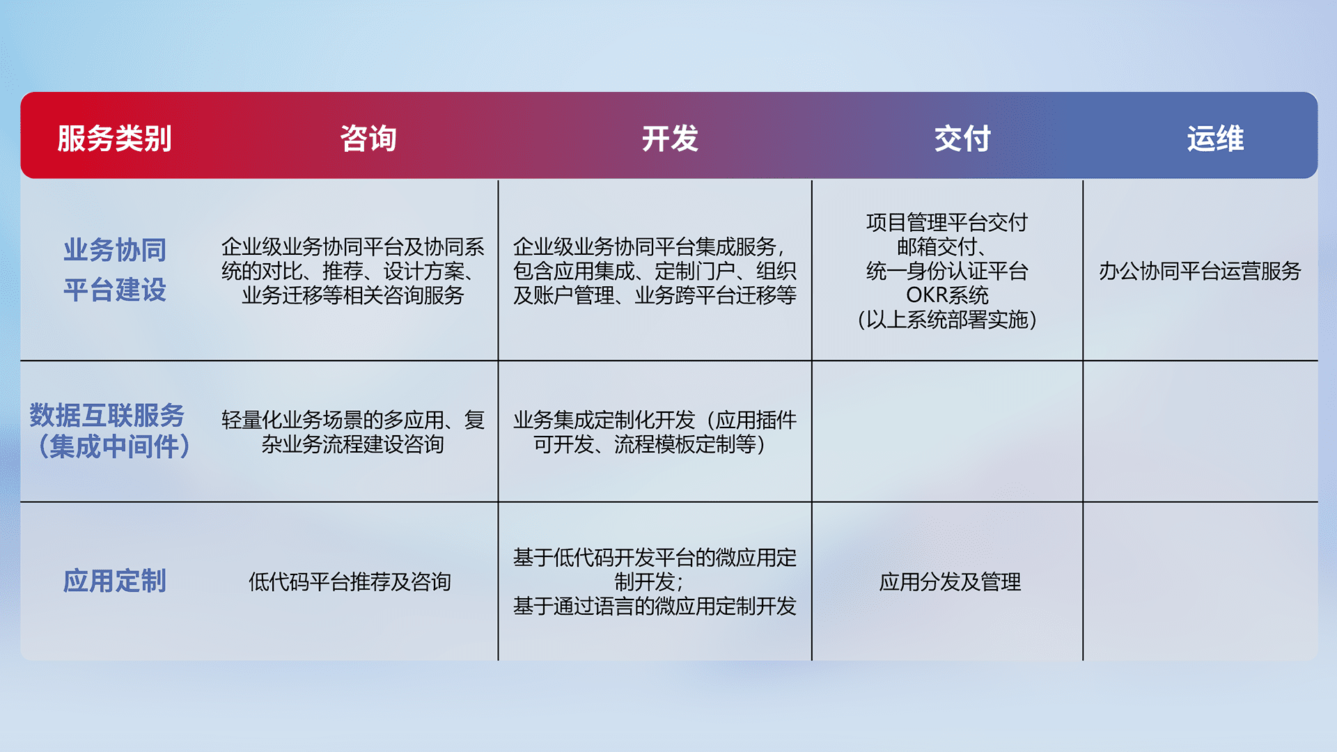 针对钉钉、、、、企微、、、IDaas等平台级产品提供产品的规划、、、、方案、、、交付、、定制化开发等服务,,实现如统一协同办公、、、智能客户服务、、、、混合会议管理、、智能数据查询、、、、等业务场景,,,实现数字化转型。。